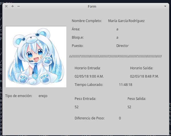 Se utilizó una base de datos para guardar los registros de los empleados y la información que posteriormente se creará. Analizando el ambiente y las necesidades de la empresa se crearon las tablas y sus relaciones, las cuales quedaron abiertas a posibles cambios por sí la empresa así lo requería. Para la creación de la interfaz gráfica así como la programación se utilizó Python, ya que este lenguaje actualmente cuenta con una gran comunidad que lo mejora de forma constante, y por lo mismo se encuentra en constante cambio y con un gran equipo que le da soporte casi diariamente. Para la lectura de las tarjetas RFID se utilizó un lector RFID, así mismo se ocupó un keypad para la introducción de una contraseña, la cual se espera el usuario proporcione después de pasar su tarjeta, y que esta sea correctamente autorizada por el mismo sistema. Tanto el lector como el keypad se conectan a un Arduino elegoo mega 2560, el cual a su vez se conecta a un módulo wifi, el cual envía la información encriptada, tanto de la tarjeta como del password del empleado a una computadora receptora, la cual guarda la información. Para la programación de estos componentes y la obtención de datos de la tarjeta junto con la conversión de la misma a un lenguaje que la base de datos pueda comprender se utilizó el lenguaje de programación de Arduino es C++. No es un C++ puro sino que es una adaptación que proveniente de avr-libc que provee de una librería de C de alta calidad para usar con GCC (compilador de C y C++) en los microcontroladores AVR de Atmel y muchas utilidades especificas para las MCU AVR de Atmel. Una vez creado el vínculo con la base de datos y el arduino se usó programación multihilos para que no hubiera necesidad de estar reiniciando el programa para el registro de los empleados, los datos de los empleados se muestran en una pantalla, obsérvese la figura 1.