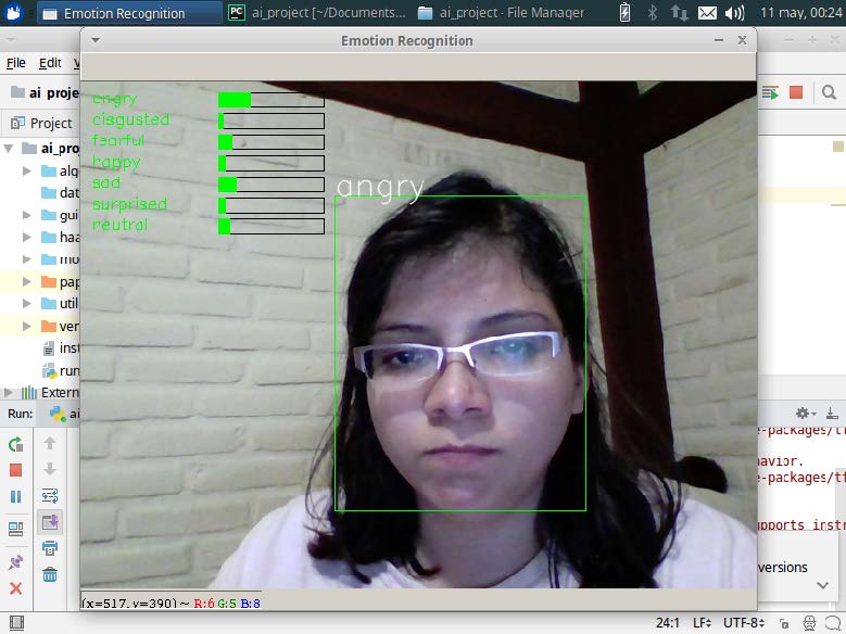 Para la programación de las emociones se investigó primero los algoritmos existentes y cuales tenían mejores resultados para una cámara no tan potente, resultando el clasificador Naive Bayes, k-NN, SMV y Multilayer Preceptron. Se utilizo python para la programación de este clasificador, aunque en esta ocasi´on se utilizo Python3 para mejores resultados. Para crear el programa de reconocimiento se utilizo TFlearn sobre Tensorflow y distintos módulos junto con bases de datos de imágenes para su posterior entrenamiento, ya implementado y funcionando el reconocimiento se puede observar en la figura 2.