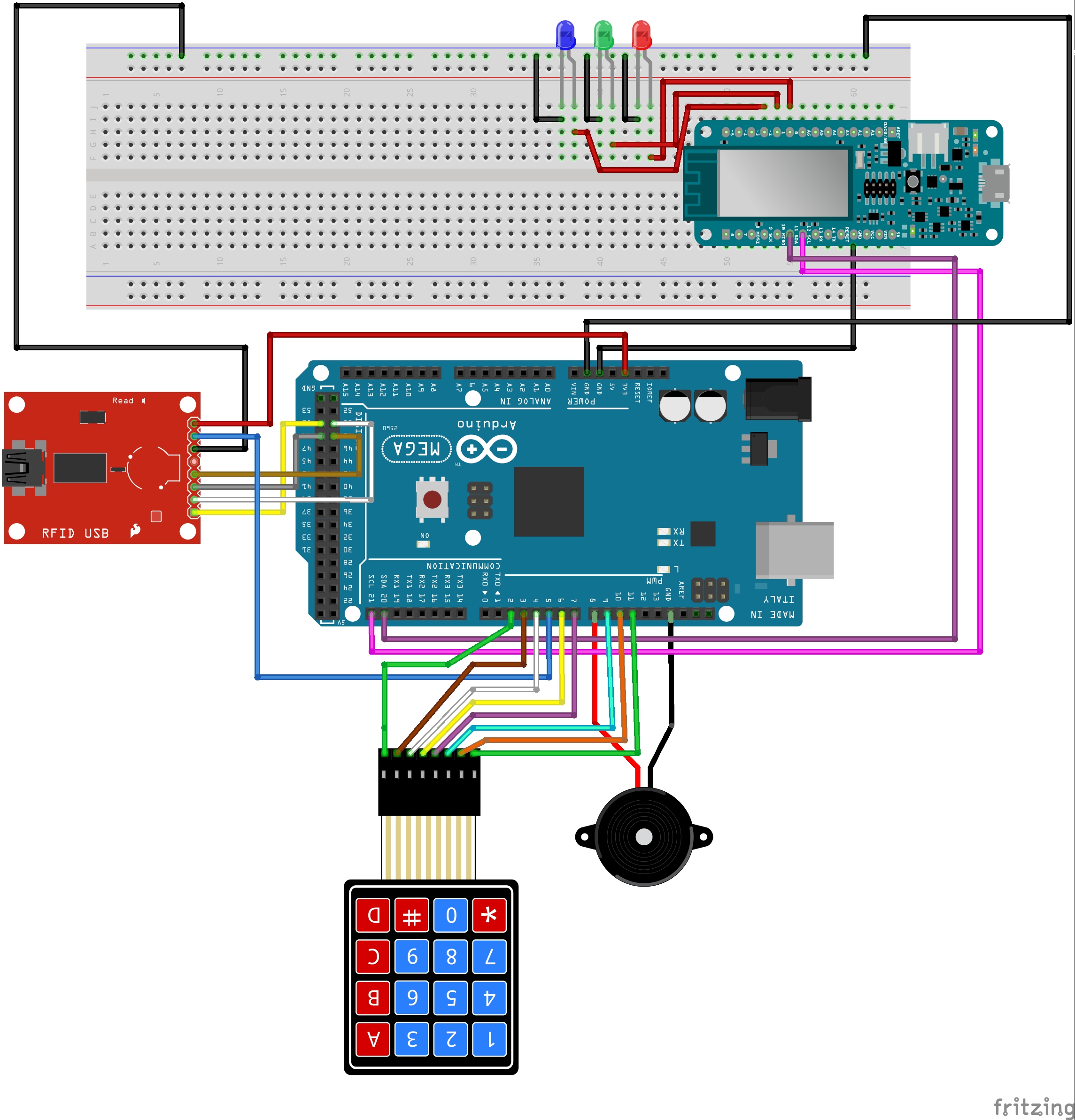 A continuación, en la figura 3, se podrá observar el diagrama básico del sistema de control. Donde se podrá observar, el módulo wi-fi, el cual enviará la información al sistema de control central y la base de datos. El lector de tarjetas RFID, así como el keypad donde el usuario insertará su clave de acceso y un buzzer, el cual sonará cuando la tarjeta sea reconocida, de igual manera cuando el password sea validado.