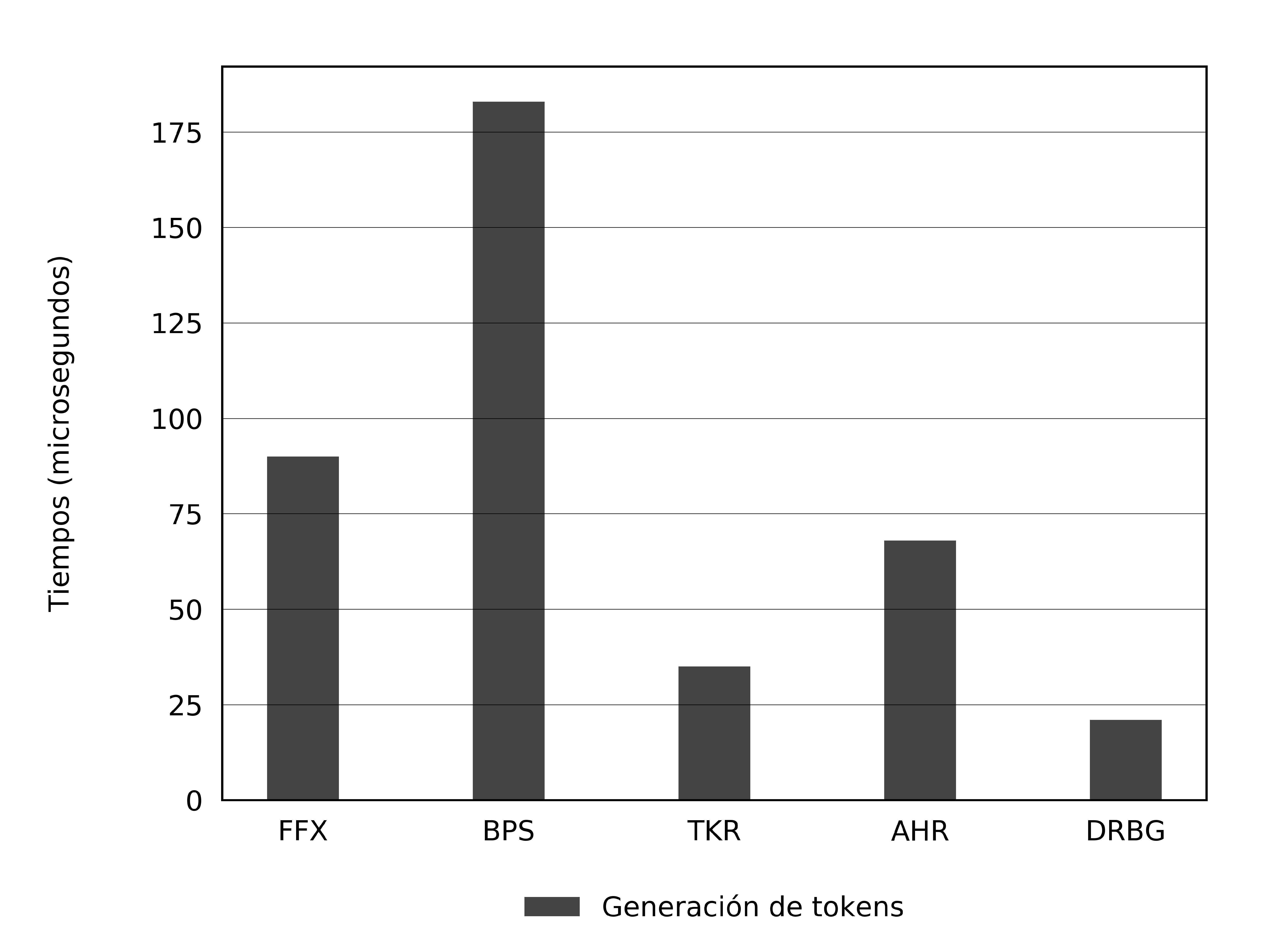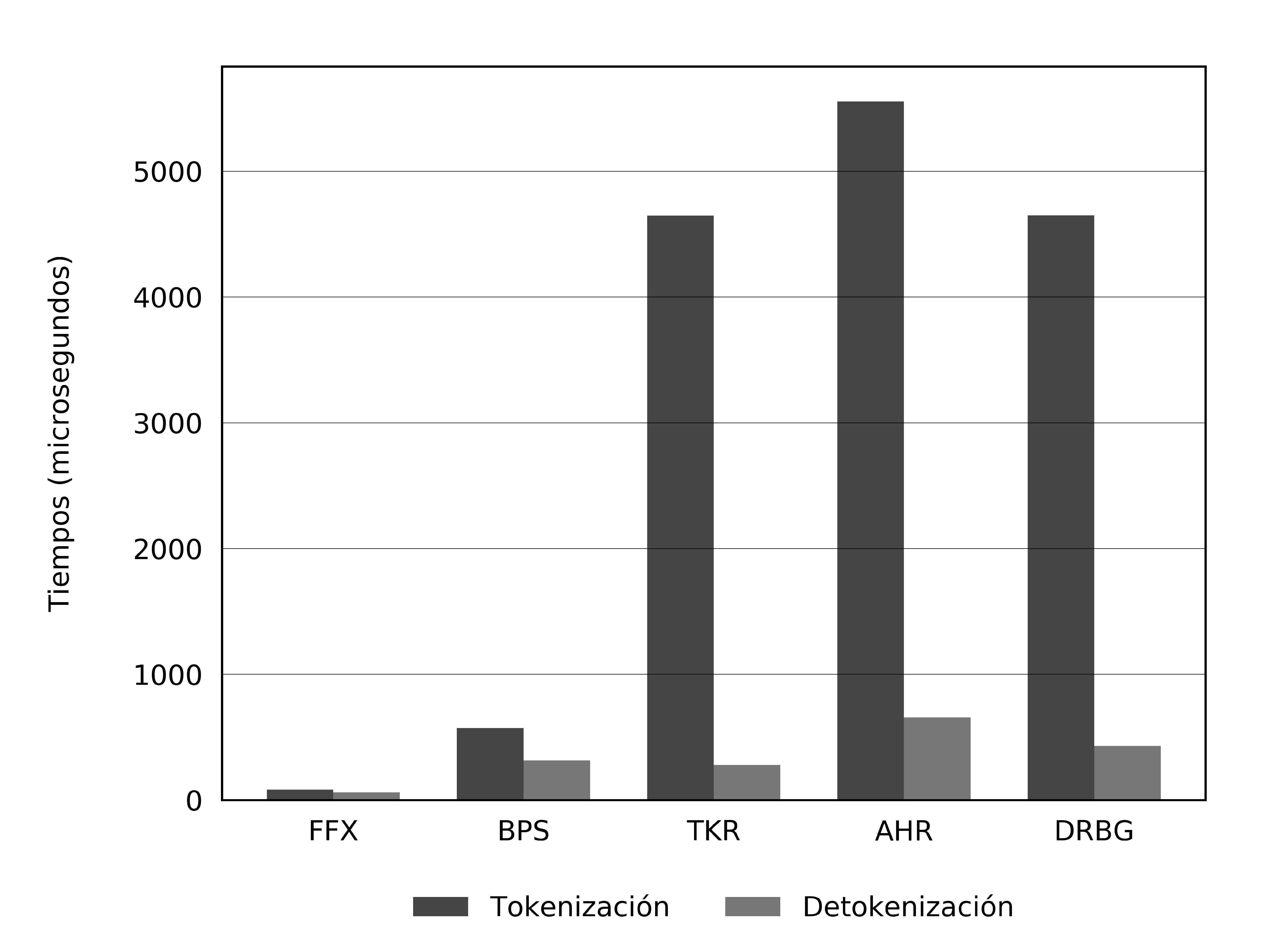 El que FFX y BPS sean más rápidos puede resultar un poco contraintuitivo, pues la generación de tokens reversibles involucra más operaciones; es por esto que en la Figura 2b se muestran los tiempos de la generación de tokens, sin tomar en cuenta tiempos de acceso a base de datos. En este caso, el más veloz es DRBG, seguido de cerca por TKR y AHR; los dos reversibles van al último.