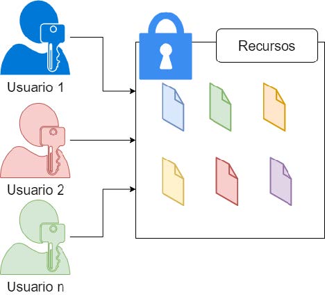 - Usuarios (Usuario 1, Usuario 2, Usuario n): Cada usuario tiene una llave que simboliza sus credenciales o permisos de acceso. Solo podrán acceder a los recursos si sus credenciales son válidas y coinciden con los requisitos de seguridad del sistema.