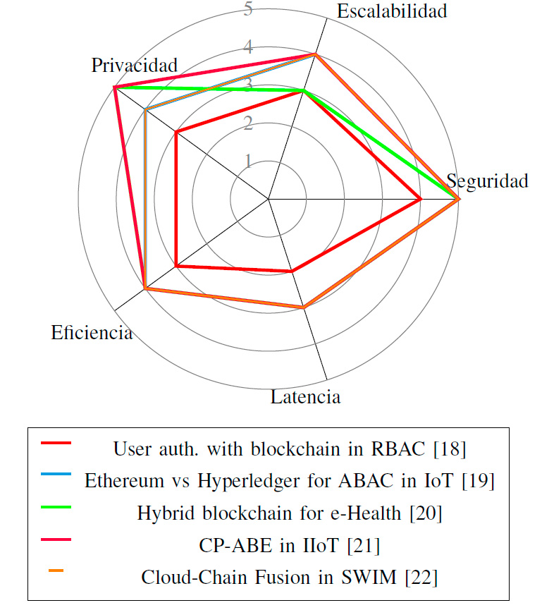 La Figura 3 muestra una comparación clara entre cinco artículos en términos de seguridad, escalabilidad, privacidad, eficiencia y latencia. Ethereum vs Hyperledger for ABAC in IoT y CP-ABE in IIoT sobresalen en seguridad con puntuaciones máximas de 5, destacando su enfoque robusto en protección de datos, mientras que Hybrid blockchain for e-Health es líder en privacidad, garantizando una alta protección de datos personales. User auth. with blockchain in RBAC tiene puntuaciones moderadas en escalabilidad y eficiencia, pero su latencia es la más baja, lo que sugiere problemas de rendimiento en tiempo real. Por otro lado, Cloud-Chain Fusion in SWIM y CP-ABE in IIoT son soluciones equilibradas con buenas puntuaciones en todas las categorías, lo que indica que son opciones versátiles y bien balanceadas para su implementación.