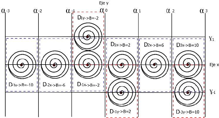 . El objetivo es elegir valores de 𝛽𝑖, de tal manera que el sistema sea estable y presente enroscados caóticos. En la Fig. 1, se muestra un diagrama de cómo están distribuidos los puntos de equilibrio marcados con puntos negros, los enroscados que se desea obtener mediante línea negra en espiral y las superficies de conmutación tanto del eje 𝑥 como el de 𝑦 marcadas como 𝛼-3 , 𝛼-2 ,…, 𝛼-3 según la región.
