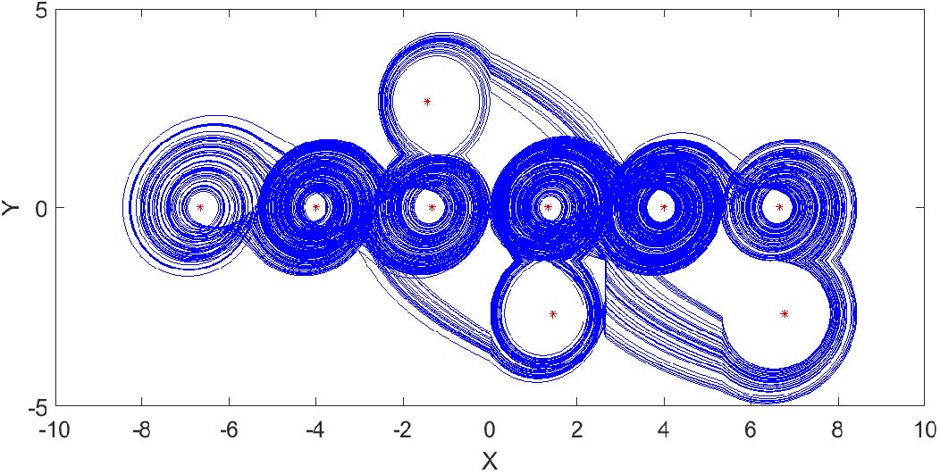 Mediante esta ley de conmutación se puede obtener un atractor de 9 enroscados, tal y como se muestra en la Fig. 2. Note que la posición de dichos enroscados desplazados en el espacio, corresponde a lo propuesto en el diagrama de la Fig. 1. Los puntos de equilibrios obtenidos tras resolver 𝑿∗ = −𝐀-𝟏𝐁 con los valores de la ec. (4) se muestran en la Tabla II.