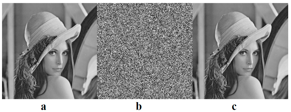 Fig. 3. Imagen Lena: (a) original; (b) cifrada; (c) descifrada.