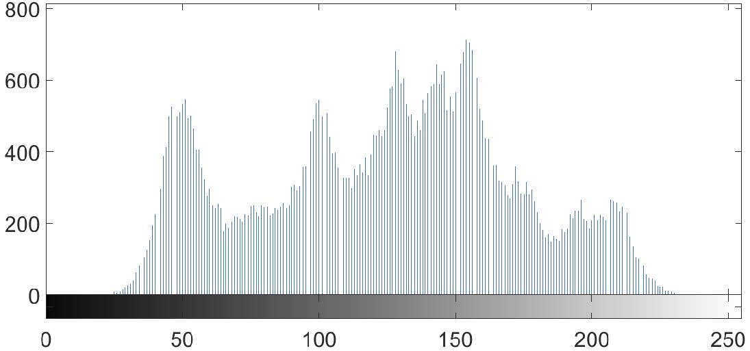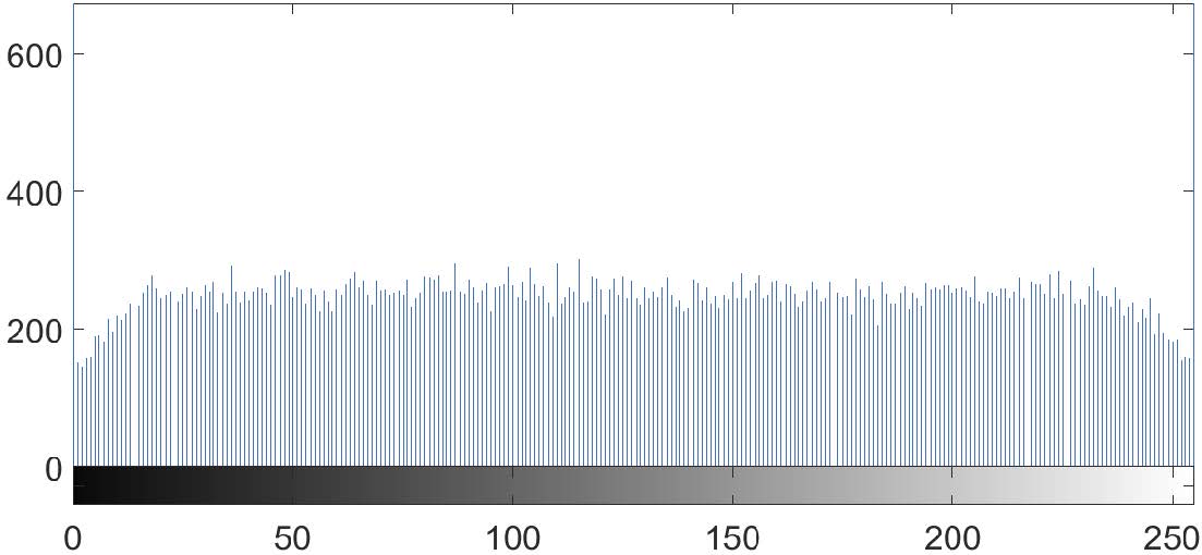 El histograma muestra cómo se distribuyen los píxeles en una imagen. Traza el número de píxeles según el nivel de escala de grises. Una propiedad que debería satisfacer un sistema de encriptación es que el histograma de la imagen encriptada presenta una distribución uniforme. Por lo tanto, los histogramas entre la imagen original y la imagen encriptada deben ser completamente diferentes. La Fig. 4 muestra el histograma de la imagen original y la Fig. 5 muestra el histograma de la imagen cifrada. Es importante mencionar que este último representa una distribución uniforme como se esperaba.