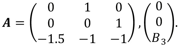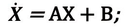En donde 𝑿 = [𝑥, 𝑦, 𝑧]T representa el vector del estado del sistema, 𝑩 = [𝐵1, 𝐵2, 𝐵3]T ∈ ℝ3 representa un vector real afín. 𝑨 = [𝑎i,j] ∈ ℝ3x3, 𝑖, 𝑗 = 1, 2, 3, denota una matriz real de coeficientes, la cual está dada por: