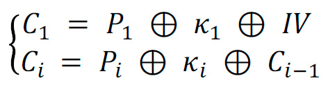 Donde 𝐶𝑖 y 𝑃𝑖 con 𝑖 = 2, . . . , 𝑛 son los pixeles de la imagen de cifrado y la imagen normal, respectivamente. Para mejorar la seguridad en el proceso, se considera una retroalimentación en el cifrado (Ci-1) y un vector inicial, donde IV ∈ {0, 1, . . . , 255} es un vector de inicialización (Initial Vector) usado una vez para el primer pixel, 𝜅𝑖 es la secuencia de bits pseudoaleatoria, el símbolo ⊕ es la operación XOR, que se ejecuta bit a bit en el bloque de 8 bits por píxel.