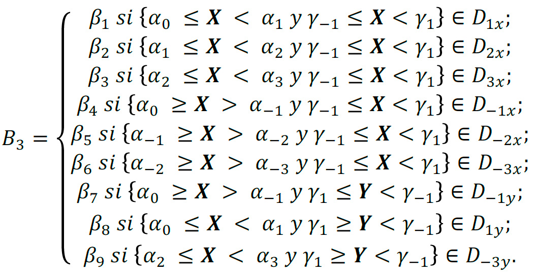 Estos valores se escogieron siguiendo la misma estructura de selección de los puntos de equilibrio que se presentan en [7]. Es importante mencionar que la distribución de estas superficies es simétrica, permitiendo que los enroscados generados presenten las mismas dimensiones. Cada espacio generado entre las superficies de conmutación corresponde con los dominios mencionados en la ec. (3). Para este caso se les asigna el nombre de 𝐷-3𝑥, 𝐷-2𝑥, 𝐷-1𝑥, 𝐷1𝑥, 𝐷2𝑥, 𝐷3𝑥 a los dominios que contienen un punto de equilibrio sobre el eje 𝑥, marcados con las casillas de línea punteada en azul en la Fig. 1. Para el caso de 𝐷-3𝑦, 𝐷-1𝑦, 𝐷1𝑦, marcados en recuadro con línea punteada roja, son los dominios que contienen un punto de equilibrio desplazado tanto en el eje 𝑥 como en el 𝑦.