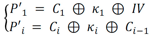 Si se usan la clave correcta 𝜅𝑖 y el vector de inicialización correcto IV, entonces la imagen original se obtendrá correctamente, es decir, 𝑃´𝑖 = 𝑃𝑖.