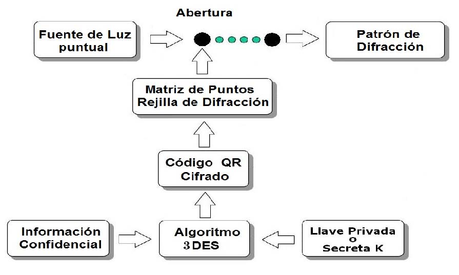 El diseño y construcción de sistemas seguridad de reconocimiento para control de acceso en la actualidad ya son más comunes y de uso diario, estos son implementaciones en medios portátiles como identificadores personales, chips dentro de tarjetas de crédito, telefonía celular, computadoras, productos o activos para almacenamiento como las RFid, por mencionar algunos. Sin embargo, algunos dispositivos no tienen integrados los servicios y mecanismos de seguridad que permiten ingresar a un sistema o a lugares altamente confidenciales en forma segura. Lo recomendable es usar llaves públicas y privadas con generadores de secuencias pseudoaleatorias para que por medio de criptografía asimétrica ingresen de forma segura [1]. La mayor parte de los servicios de seguridad se logran mediante la implantación de algoritmos de cifrado, ya sea en hardware o software [2]. Algunos mecanismos como las marcas de agua son empleadas como candados en documentos valiosos, un ejemplo son los billetes de dinero para verificar su integridad y su autenticidad. Aunque la seguridad por obscuridad no es la forma de obtener dispositivos o medios seguros. La combinación de mecanismos de seguridad mediante Criptografía y Esteganografía trae consigo un aumento en el nivel de seguridad en el diseño de nuevos dispositivos portátiles de control de acceso [3]. La ventaja de la creación de los códigos QR de pronta lectura, es que fueran leídos por dispositivos portátiles electrónicos de almacenamiento para el manejo masivo de información como en el caso de levantamiento de un inventario [4]. Los QR fueron inventados por una empresa japonesa como sucesores de los códigos de barras, a nosotros nos interesan por dos razones, para guardar información confidencial cifrada en ellos y la generación de la matriz de puntos. La matriz de puntos a su vez genera una rejilla que al incidir sobre ella luz producirá el fenómeno de difracción, luego mediante el fenómeno de superposición de ondas electromagnéticas se tendrá su correspondiente patrón de difracción [5]. El patrón de difracción formado por la superposición tiene información de los códigos QR cifrados mediante el algoritmo 3DES [6]. En óptica física sabemos que el fenómeno de propagación sobre una apertura (rejilla de difracción) es semejante a obtener la transformada de Fourier para obtener los patrones de difracción podemos producir imágenes en dos dimensiones de los patrones que serán nuestras marcas de agua [6]. Estas marcas de agua se insertarán o quemarán para hacer los dispositivos ID ópticos únicos a su correspondiente código QR cifrado, mediante el daño óptico sobre un cristal [7]. El esquema del procedimiento empleado se muestra en la Fig.(1). Para verificar la información