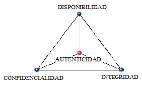 Los servicios de seguridad (SS) que se manejan para el intercambio de información mediante un protocolo de comunicación son: confidencialidad, autenticidad, integridad, no repudio, control de acceso y disponibilidad [11]. No es posible implementarlos todos pero si se pueden implementar algunos gracias a los mecanismos de seguridad que han sido desarrollados hasta ahora. Estos pueden recordarse fácilmente en el triángulo de oro de la Fig. (2), (aunque en realidad se convierte en el tetraedro de oro). La Disponibilidad como SS está fuera del alcance de los mecanismos de seguridad, lo cual puede ser discutido en análisis subsecuentes de dichos mecanismos. El control de acceso dependerá del sistema de seguridad que se implemente [12].