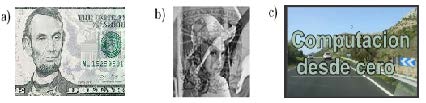 Fig. 3. Marcas de agua sobre a) billetes, b) imagénes y c) videos.