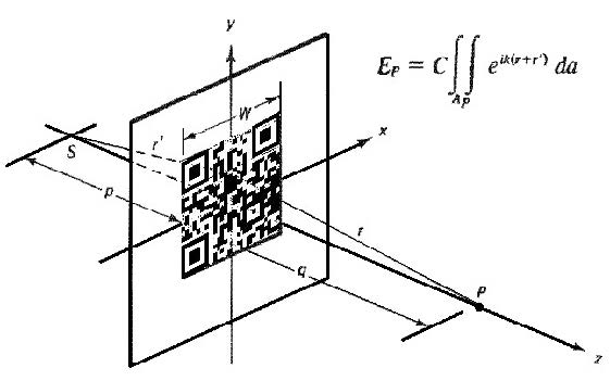 La radiación electromagnética representada en forma de luz se ha usado para explicar el fenómeno de interferencia en óptica, de acuerdo a que dos o más ondas coherentes individuales de luz, procedentes de una fuente única y separada por división de amplitud o frente de onda, se juntan para interferir. Particularmente, el mismo fenómeno está implicado en la difracción de la luz. La difracción es cualquier desviación de la óptica geométrica que resulta de la oclusión de un frente de onda de luz. Así una pantalla semitransparente con un orificio representa dicha oclusión y en una pantalla situada más allá del orificio, el círculo de la luz puede mostrar complejos efectos de borde. Este tipo de oclusión es común en muchos instrumentos ópticos que utilizan la parte de un frente de onda que pasa a través de una lente redonda. Una oclusión poligonal irregular muestra la estructura detallada en su propia sombra lo cual es inesperado sobre la base de la óptica geométrica. Efectos de difracción son una consecuencia del carácter de onda de la luz. Además si el obstáculo no es semitransparente, es decir, si éste causa transiciones locales en la fase o la amplitud del frente de onda de la luz transmitida, se observarán estos efectos. Ciertas imperfecciones en una lente producen patrones de difracción no esperados al transmitir luz láser. Debido a que se desvanecen los bordes de las imágenes ópticas por difracción, el fenómeno se limita a la precisión de la posición de los elementos del sistema como en el caso de los interferómetros. Si la fuente de luz tanto como la pantalla de observación están efectivamente lo suficientemente lejos de la abertura de difracción los frentes de ondas que llegan a la abertura y a la pantalla de observación pueden considerarse planos, se dice entonces que tenemos difracción de Fraunhofer o campo lejano; cuando éste no es el caso y la curvatura del frente de onda debe tomarse en cuenta para el cálculo del campo, tenemos difracción de Fresnel, o de campo cercano [13]. Para generar los patrones de difracción hacemos incidir luz láser sobre la matriz de puntos de los códigos QR cifrados en campo lejano [14]. Los patrones de difracción producidos son las marcas de agua generadas bajo el esquema que se mostró en la Fig.(1).