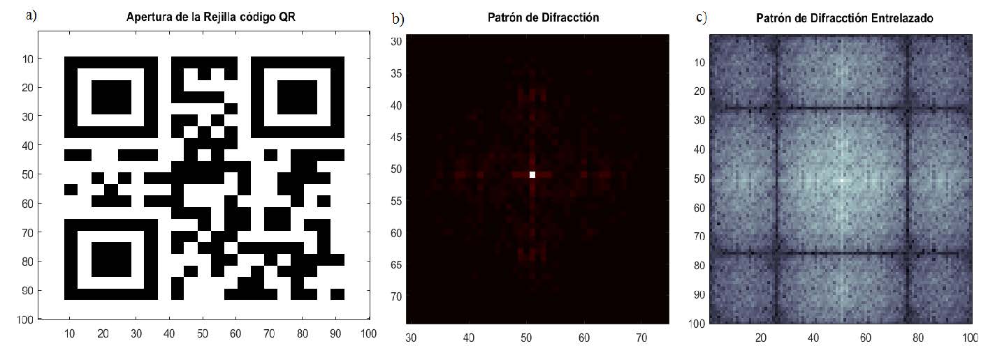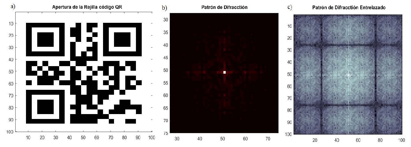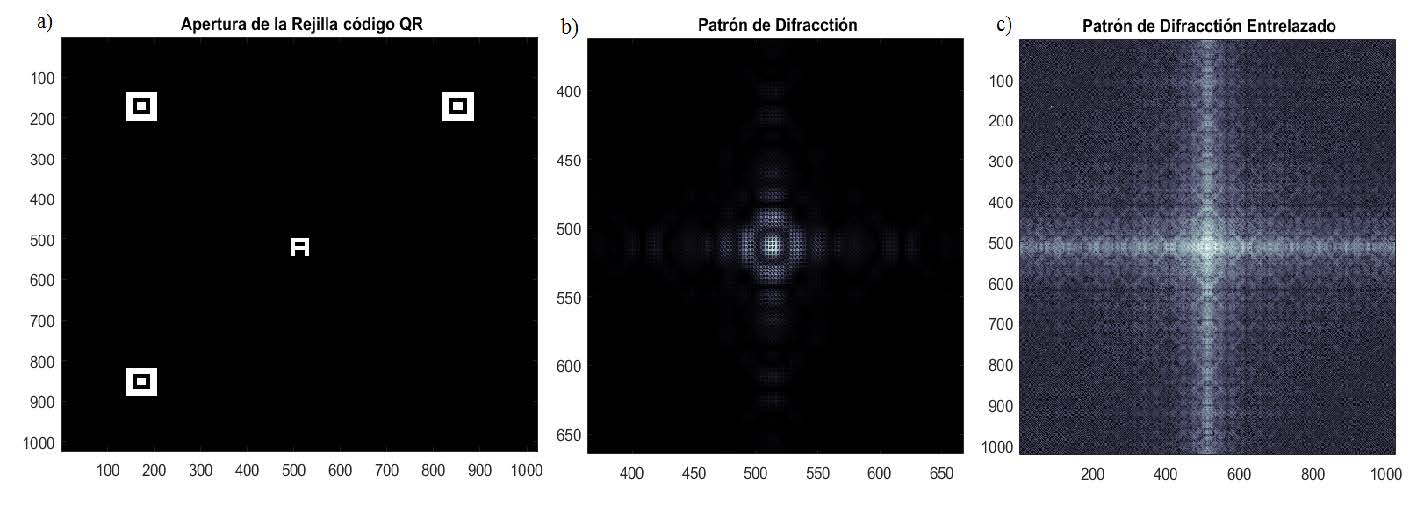 se debe realizar el procedimiento inverso, escanear las marcas de agua producidas por los códigos QR, descifrar con el algoritmo 3DES para visualizar el texto plano. Debemos tener presente que las marcas de agua pueden ser perceptibles o imperceptibles dependiendo cuanta información se quiera ocultar en el patrón de difracción o el medio portador. En otros trabajos sobre marcas de agua imperceptibles en imágenes y en audio [8], [9], el procedimiento es procesar información para introducirla y ocultarla en un medio portador digital mediante algoritmos de inserción de forma imperceptible [10]. El patrón de difracción generado mediante la transformada de Fourier en dos dimensiones de la rejilla, es producido por la abertura y la propagación de radiación electromagnética a través de ella. Esto es lo que determina el procedimiento para ocultar la información y el fenómeno debe cumplir con las condiciones de interferencia mediante la superposición de ondas en un corte plano perpendicular a la dirección de propagación.