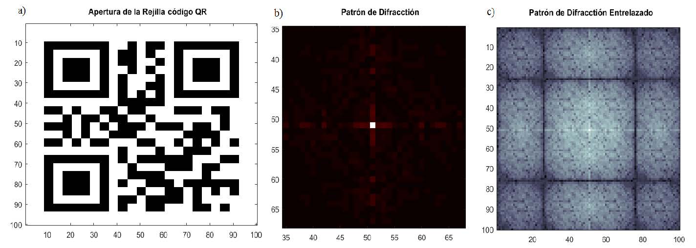 El primer paso es cifrar la información confidencial o texto plano, pueden ser datos personales, con el algoritmo 3DES. Un segundo paso es generar el código QR correspondiente con esta información cifrada. En el tercer paso la matriz de puntos creada en el código QR es una imagen digital en blanco y negro en mapa de bits de 256 colores de 400x400 pixeles, hay que convertirla en una imagen de mapa de bits monocromático para que podamos usarla como rejilla de difracción. Para generar una rejilla de difracción o abertura usaremos dos técnicas, una es a través del modelo matemático de la abertura, la otra es a través directamente de la imagen del código QR cifrado y simular la propagación sobre ellas. Realizaremos varios casos, en el primero generamos la abertura de la letra “A” con los tres cuadros de referencia del código QR. Entonces con la siguiente expresión: