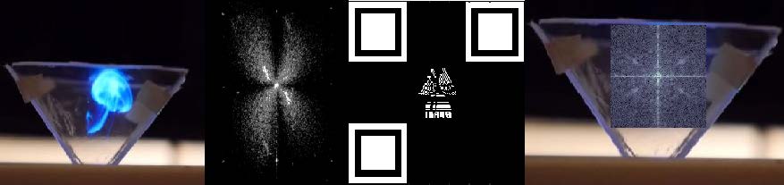 Fig. 11. Hologramas creados y grabados dentro de un cristal (las dos imágenes de la izquierda). Un código QR con logotipo y su grabado (las dos imágenes de la derecha).