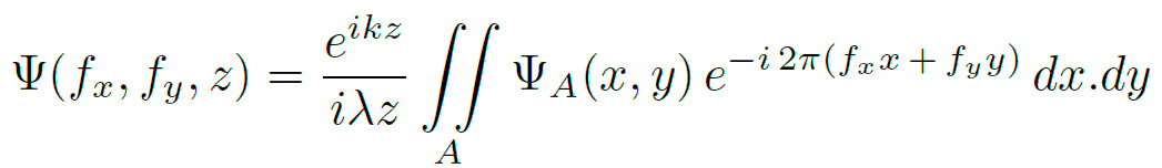donde ψ A(x, y) es la abertura y fx y fy están relacionadas con las frecuencias espaciales, λ la longitud de onda, k el vector de onda, z la dirección de la propagación. La ecuación (2) se puede obtener a partir de la integral de superficie de Fresnel-Kirchhoff usada para la difracción sobre aberturas con simetría rectangular [13], Fig.(5). Cuando la integral se define sobre el intervalo [−∞, ∞] se convierte en la transformada de Fourier de la abertura, F( ψA(x, y)). El resultado de la solución de la integral de propagación es el patrón de difracción generado sobre la pantalla de observación y para el patrón entrelazado se calcula el logaritmo en base 2 de la Transformada de Fourier resultante.