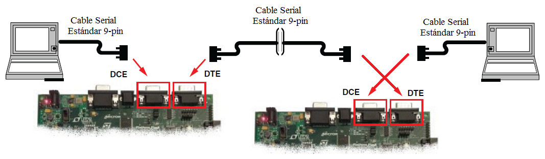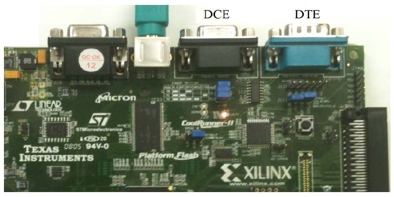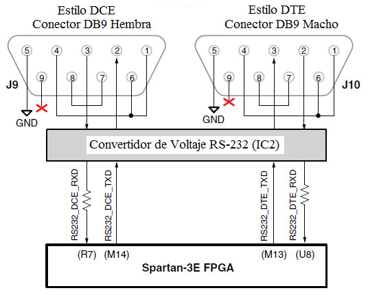 En esta sección se presenta la configuración que tienen las interfaces seriales en la tarjeta de desarrollo Starter Kit Spartan 3E de Xilinx, además de mostrar un esquema de conexión según la plataforma diseñada para realizar la comunicación serial segura. Los dos puertos serie que tiene la tarjeta Spartan 3E en la parte superior derecha, en realidad son dos conectores físicos DB9 denotados por DCE (hembra) y DTE (macho). El puerto estilo DCE se conecta directamente con el conector del puerto serial disponible en la mayoría de las computadoras personales vía un cable serial “straight-through” estándar. Un adaptador de géneros o cables cruzados no se requieren. Se usa el conector estilo DTE para controlar los otros periféricos RS-232, tales como módems o impresoras, o realice la prueba de “loopback” simple con el conector del DCE. La Figura (6) muestra la configuración de los pines para ambos estilos de conectores. El control de flujo del hardware no se apoya en el conectador. Las señales DCD, DTR, y DSR del puerto se conectan juntas, según se muestra en la figura. Similarmente, las señales RTS y CTS del puerto se conectan juntas. Se observan también los pines de conexión a la tarjeta Spartan 3E de acuerdo a las siguientes señales: