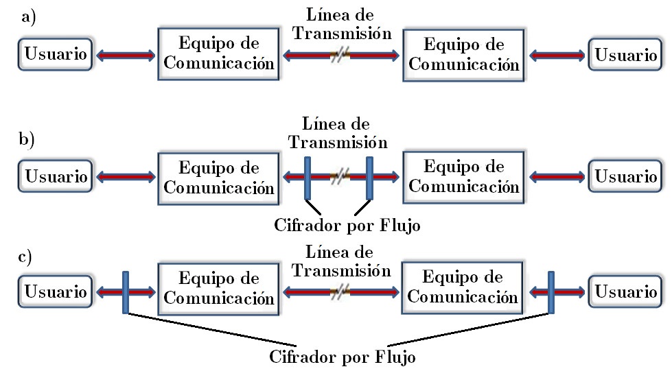 Figura 2. Diagrama de bloques de un sistema de comunicación simplificado. a) Sistema Inseguro. b) Sistema con el cifrado en los extremos de la línea de la transmisión. c) Sistema con el cifrado como interfaz entre el usuario y el equipo de comunicación.