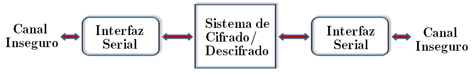 Para alcanzar la primera meta, los dispositivos fueron diseñados para ser integrados en cada lado del sistema de comunicación, se pueden colocar en los extremos de la línea de la transmisión, o se colocan como una interfaz entre el usuario y el equipo de comunicación. Dependiendo del uso en donde el cifrado será utilizado y de las características del equipo y del medio de transmisión será el lugar más conveniente para implementar el proceso de cifrado. La Figura (2) muestra un diagrama de bloques de cómo la integración del sistema de seguridad se puede emplear en un sistema de comunicación. El mecanismo que cifra debe contener