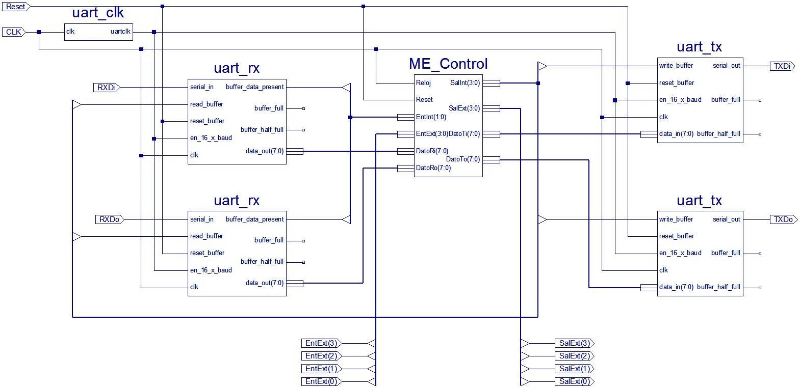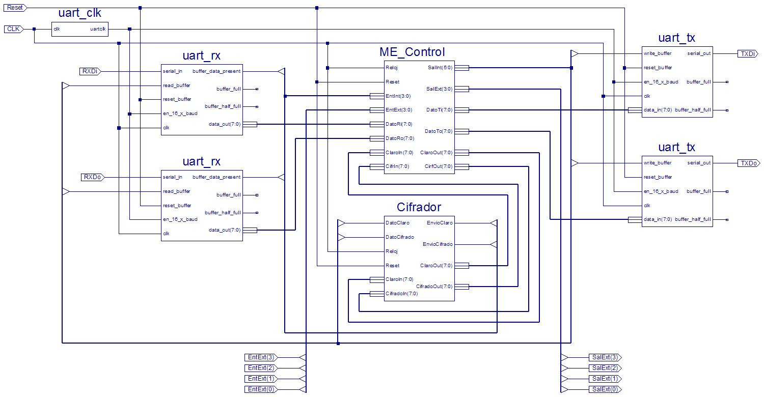 criptográfica y se utiliza para poner un proceso de cifrado en ejecución en un sistema de comunicación. En las pruebas de funcionamiento se colocaron dos de estos dispositivos entre dos PC que se comunican a través de un puerto serial RS-232. Los resultados de estas pruebas se presentan en la quinta sección de resultados. Con este diseño se puede verificar que la idea general funciona, pero esto no resuelve las características que se precisaron para la plataforma criptográfica, aquello de que debe ser fácil cambiar el algoritmo criptográfico usado. Esto es debido a que como se encaja dentro de la máquina de estados del control es necesario modificar el sistema entero para realizar un cambio simple. Por lo que se modifica este sistema para llevar al elemento de seguridad fuera de este control, colocando los procesos de cifrado/descifrado en un bloque separado, de modo que el bloque de control sea solamente responsable de manejar la comunicación a través de los UARTs, una vez que los datos sean procesados. Se toma la precaución para proveer al bloque de cifrado/descifrado los medios para que pueda trabajar con el bloque de control sin importar el algoritmo usado, de tal manera que la interfaz entre estos dos bloques sea tan general como sea posible y que cuente con los mecanismos necesarios para alcanzar esto. Se define un protocolo simple de apretón de manos para informar al bloque de cifrado/descifrado cuando hay ciertos datos que se procesarán y posteriormente que de informe al bloque de control cuando han terminado los procesos, tomando cuidado de no perder información en el proceso evitando mandar más datos al bloque cifrador hasta que no haya terminado el proceso de los datos actuales. Al final, aunque el alcance