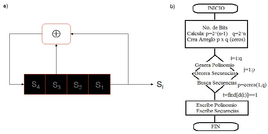 Figura 1. a) Diagrama de un LFSR de 4 bits con P(x) = x3 + x + 1 y b) diagrama de flujo para el cálculo del polinomio primitivo y secuencias generadas.