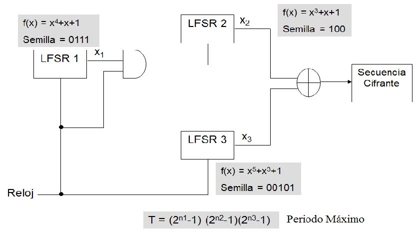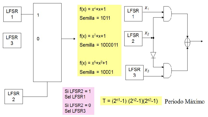En la creación de estructuras no lineales usando LFSR se han construido varias estructuras donde se intenta aumentar el periodo de las secuencias binarias generadas, donde ahora el cálculo del periodo máximo es el producto del periodo máximo de cada LFSR contenido en la estructura. En la literatura se pueden encontrar algunas estructuras haciendo uso de LFSR en diferentes configuraciones que pueden ser síncronas o no sincronizadas. En la Figura(5) se muestra una primer distribución de LFSR conocida como generador Geffe. Una segunda estructura usando LFSR de diferentes tamaños se