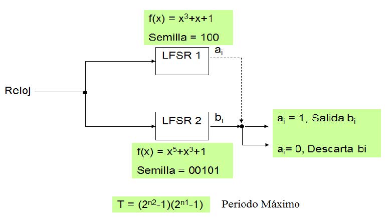 ilustra en la Figura (6), denomida como generador Beth - Piper. Una tercer estructura al final de esta sección se presenta en la la Figura (7), que tiene el nombre de generador Shrinking. Hay muchos desarrollos de cifradores de flujo con diversas estructuras usando e implementando LFSR en su construcción que fueron las raices de las primeras aplicaciones como urnas electrónicas, tokens para control de acceso o en telefonía célula