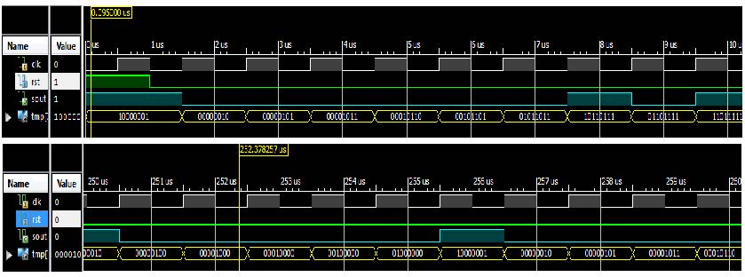Figura 9. Simulación en ciclos de tiempo del LFSR de 8 bits seleccionado desarrollado en el simulador de la plataforma Xilinx.