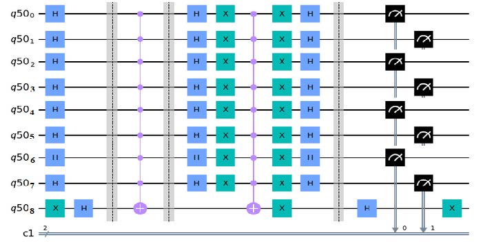 Es decir, el tercer qubit es controlado por los dos primeros, pero ocurre un efecto interesante, como los dos primeros qubits se les aplica la compuerta H al aplicar el operador CNOT los qubits de control se ven afectados, en particular el elemento correspondiente al índice |11111111〉 sufre un cambio de signo, que es justo lo se busca, este fenómeno se conoce como phase kickback. Luego se implementa la inversión y se emplea la compuerta de Hadamard de 8X8 con entradas iguales a 0.5 y de -0.5 en la diagonal principal. Ahora se usan ambos operadores para implementar el algoritmo: