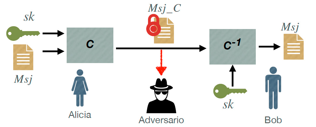 Los cifradores son una primitiva criptográfica usada para transmitir información confidencial entre dos o más entidades (personas, computadoras, robots, etc.). La figura 1 muestra como Alicia le envia un mensaje cifrado a Bob a través de un canal inseguro de comunicación. A pesar de que el adversario puede interceptar el mensaje cifrado Msj_C, éste no podrá conocer el mensaje original.