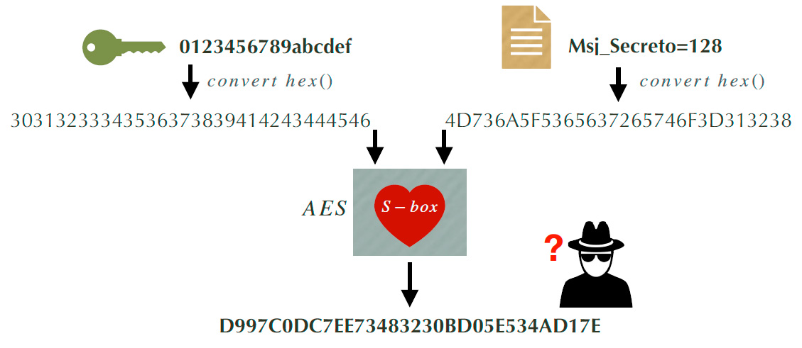 Las cajas S son funciones no lineales que actúan como los componentes principales en los cifradores, generando textos cifrados incomprensibles para el adversario. En la figura 2, se puede observar este efecto al cifrar el texto en claro Msj_Secreto = 128 utilizando AES-128 y la llave secreta 0123456789abcdef. Por esta razón, las cajas S son consideradas como el corazón de los cifradores.