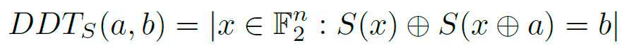 , la DDT de S es una tabla de tamaño 2n × 2m donde cada celda contiene el número de parejas a, b que cumplen la siguiente ecuación: