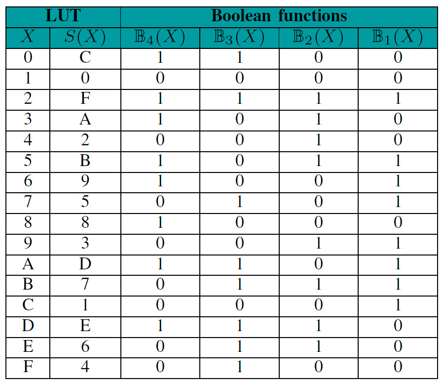 La tabla I muestra la LUT de la función vectorial de la caja de TWINE y sus 4 funciones Booleanas. Se puede observar que la unión de las cuatro funciones Bi(X) es la representación binaria de la salida hexadecimal S(X). Esta conversión ayudará a enteneder la representación ANF de una caja S.